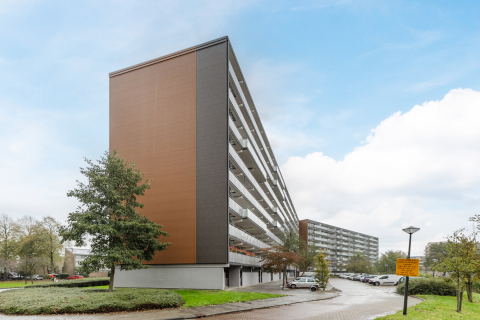 Slaapkamer IV, gelegen aan de voorzijde. Ook deze slaapkamer heeft toegang tot het balkon. Eveneens voorzien van vloerbedekking, stucwerk wanden en plafond.
